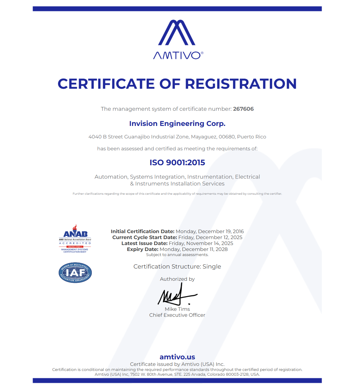Our organization executes within a framework of quality controlled processes. We have established a Quality Management System (QMS) based on ISO 9001:2015.